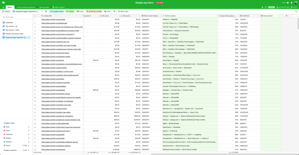 A daily updated Airtable database of all Shopify apps and key signals to use to discover dev opportunities, M&A, competitor tracking, keyword optimization and more